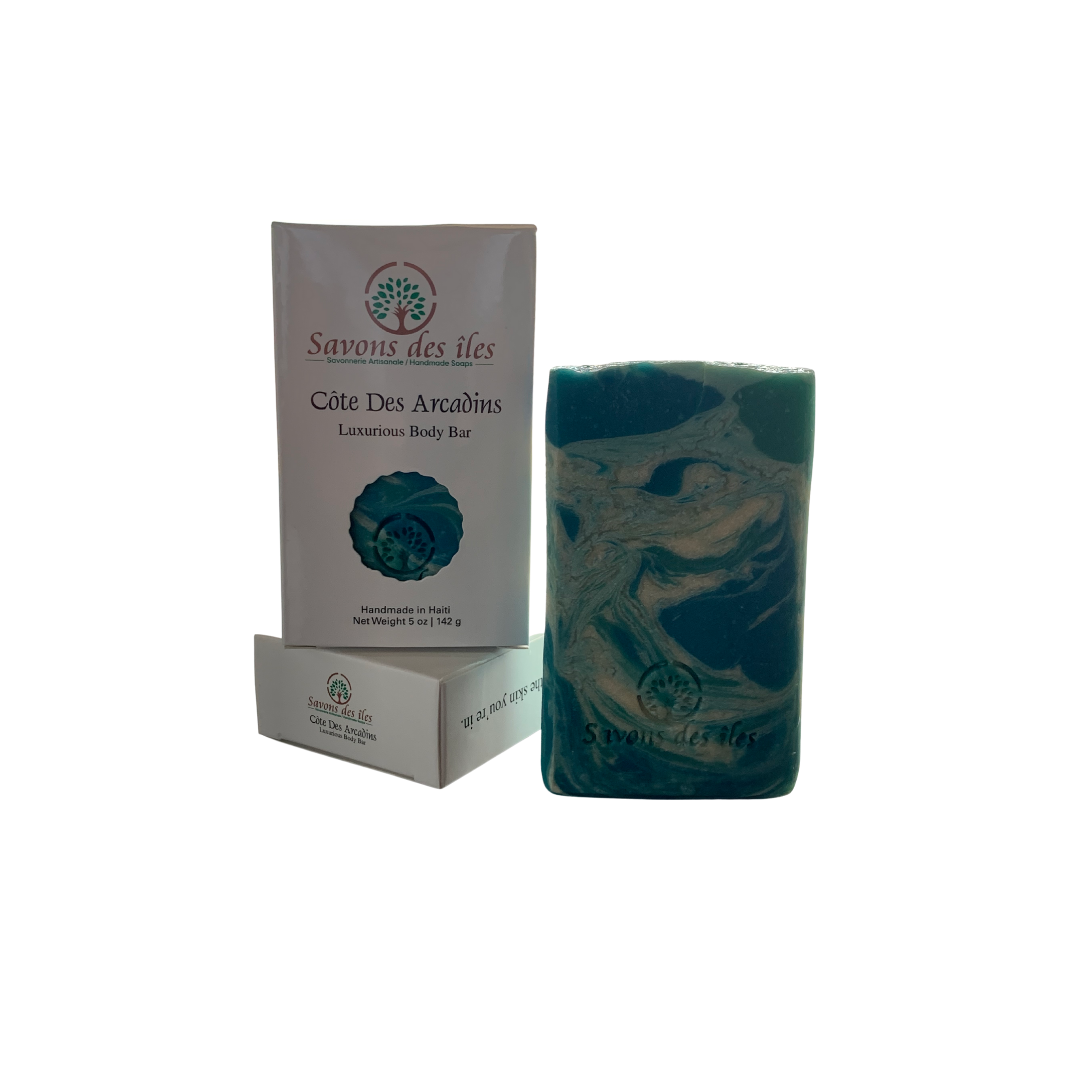 Huile d'olive saponifiée, noix de coco, palme, ricin originaire d'Haïti et huiles de beurre de karité. Lait de coco, eau, huile de vitamine E, lactate de sodium,, fragrance, mica, dioxyde de titane.