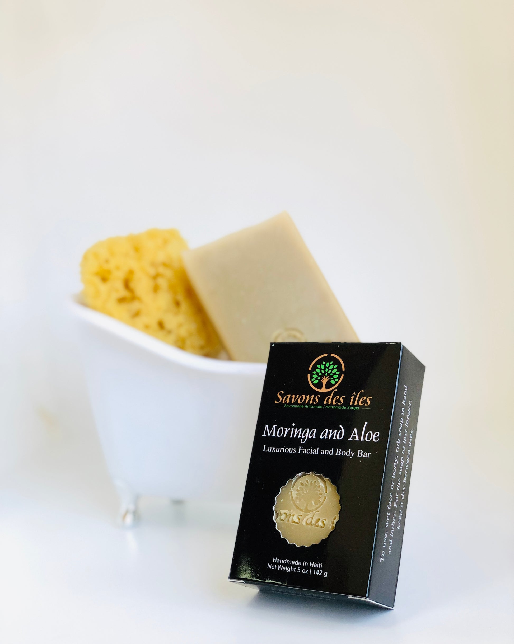 Im gaga pour le Moringa. Ce pain de savon est peut-être l'un de mes nouveaux favoris. C'est une idée que j'envisage depuis un certain temps et qui s'est finalement concrétisée. Après de nombreuses recherches et d'innombrables voyages dans des fermes à la fois en Haïti et aux États-Unis, j'ai pu extraire la quantité parfaite de jus des feuilles, la mélanger avec le plus doux des Aloès et vous donner ce petit coin de paradis. Je ne pourrais pas être plus heureux avec la recette et je suis certain que vous l'aimerez aussi. well.